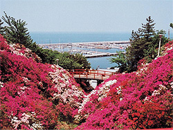 海を望む丘陵地に、5万本のつつじと800本の桜が植えられています。4月には桜が、4月下旬から5月上旬にかけてはつつじの花が咲き誇ります。桜とつつじに囲まれた散歩道を登り、海を眺めながらの散策がおすすめです。