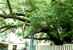 樹齢500年とも800年とも言われている岡中鎮守社の大樟は大阪府の天然記念物でもあり、大阪みどりの百選にも指定されています。樹幹の周囲は根元では12mほどあり、枝がおおう面積は300m2にもなります。