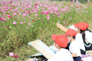 貝塚市木積土地改良区の農空間保全協議会の管理農地で10月13日、貝塚市立葛城小学校3年生の児童28名が参加し、コスモスのスケッチと摘み取り体験を行いました。