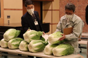 12月14日、熊取町煉瓦館にて令和3年度冬春農産物品評会を開催しました。キャベツやフキ、ハクサイなど合計52点が出品。熊取町、市場関係者、大阪府、当JAの4名が審査し、中尾修さんのフキが最高位の大阪府知事賞に選ばれました。 審査にあたった泉州農と緑の総合事務所 農の普及課・宮﨑副主査は「例年とは異なる気象条件にもかかわらず、出品された農産物はみな、きめ細やかな栽培管理がうかがえる素晴らしいものでした」と審査講評されました。