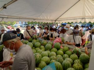熊取町地産地消推進協議会と熊取町農業改良クラブは8月11日、熊取町煉瓦館前歴史公園で毎年恒例の西瓜市を開催しました。