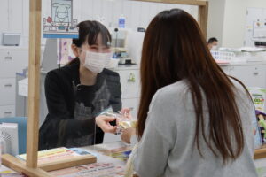 泉佐野中央支店は5月11日と12日の2日間、お客様感謝祭を行い、「母の日」に合わせ来店客100名へ和菓子をプレゼントしました。支店協同活動の一環です。