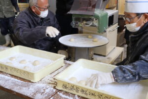 つき上がった餅は正月用の鏡餅や丸餅にして地場野菜とともに販売し、餅や野菜を買い求める多くの人で賑わいました。