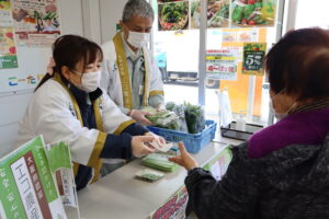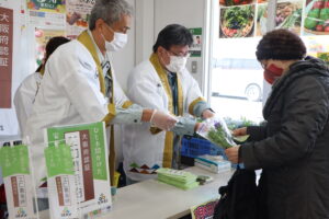 この日は地元農家がエコ栽培で育てたお米「泉州産エコ米」をPRするほか、直売所で2,000円以上購入した来店客(先着100人)に、府内生産量が全国のなかでもトップを争い、大阪エコ農産物にも認証されている春菊をプレゼントしました。