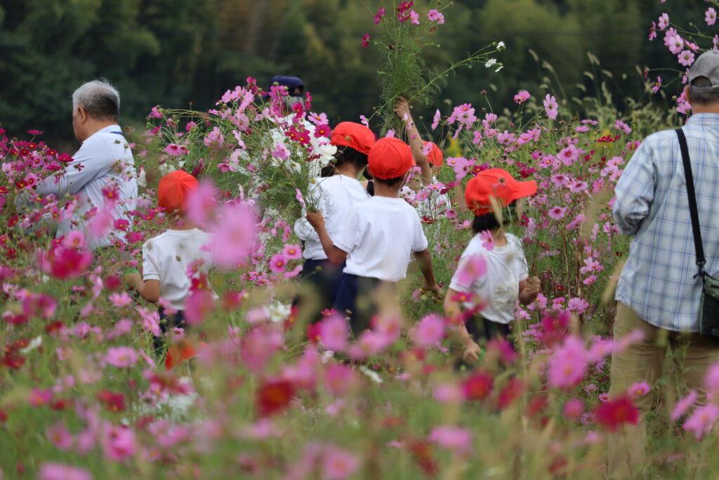 種子はJAから景観作物として毎年提供しており、7月に同校の児童たちが種まきをしたものです。コスモスは今年の異常な暑さにも負けず、児童たちの背を追い越すほど大きく育ちました。